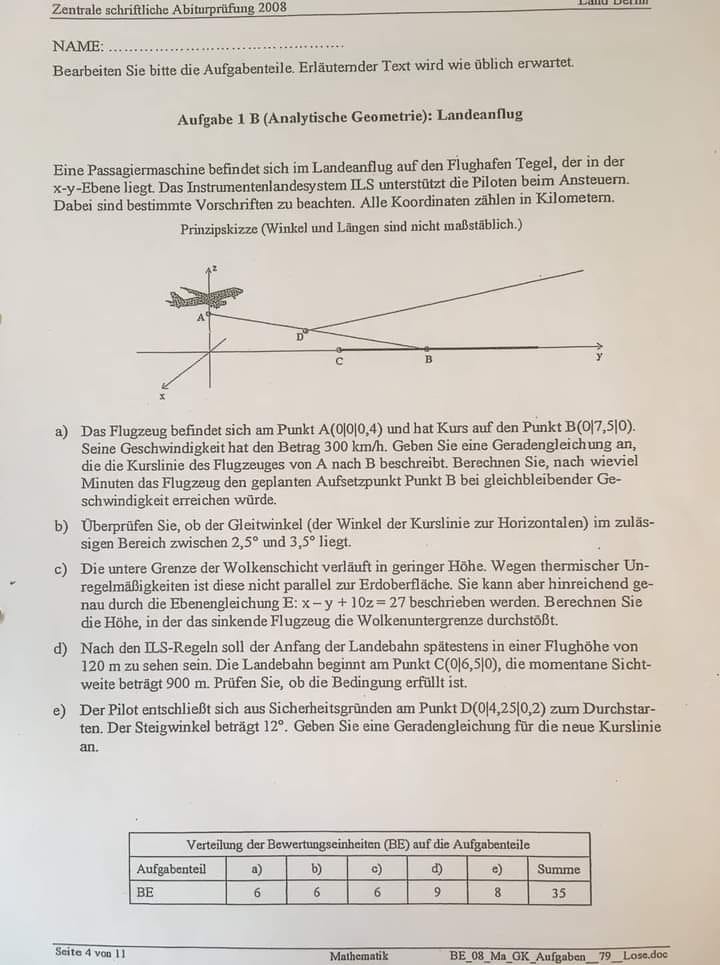 Một máy bay dân dụng sắp hạ cánh xuống sân bay Tegel (Berlin). Sân bay này nằm trên mặt phẳng x-y. Thiết bị kiểm soát hạ cánh ILS giúp các phi công hạ cánh an toàn. Họ phải tuân thủ các quy định. Tọa độ được tính bằng đơn vị km. (Sơ đồ phác họa không chứa các thông số như góc, độ dài)