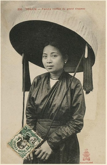| Hình ảnh người phụ nữ Việt trong trang phục áo dài giao lĩnh được ghi lại ở tài liệu của Pháp. |