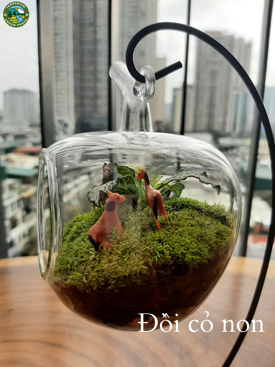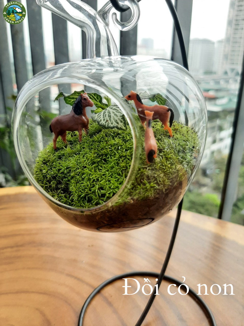 - Thành phần: sỏi suối to, sỏi suối nhỏ, rêu khô, than hoạt tính, đất trồng, rêu cỏ, cẩm nhung xanh, phụ kiện gia đình ngựa (3 con) và bọ rùa.