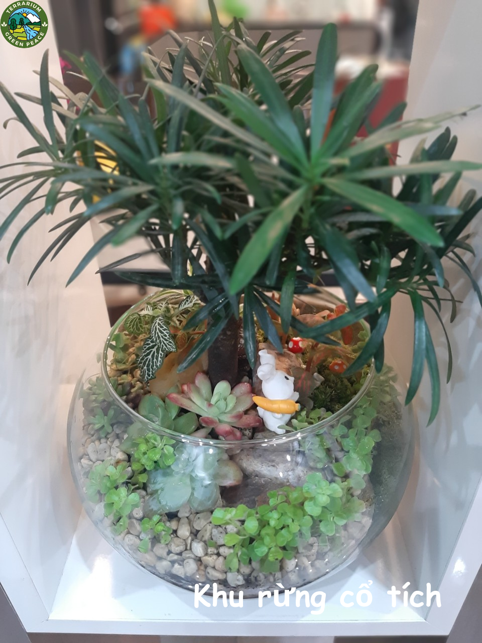 - Thành phần: sỏi to, sỏi nhỏ, rêu khô, than hoạt tính, đất trồng, Tùng la hán, lan chi, một số loại sen đá, cẩm nhung đỏ và xanh, sedum bạc hà, phụ kiện (Sóc, hươu, thỏ, bọ rùa, ngôi nhà quả thông, nấm đỏ và cam)