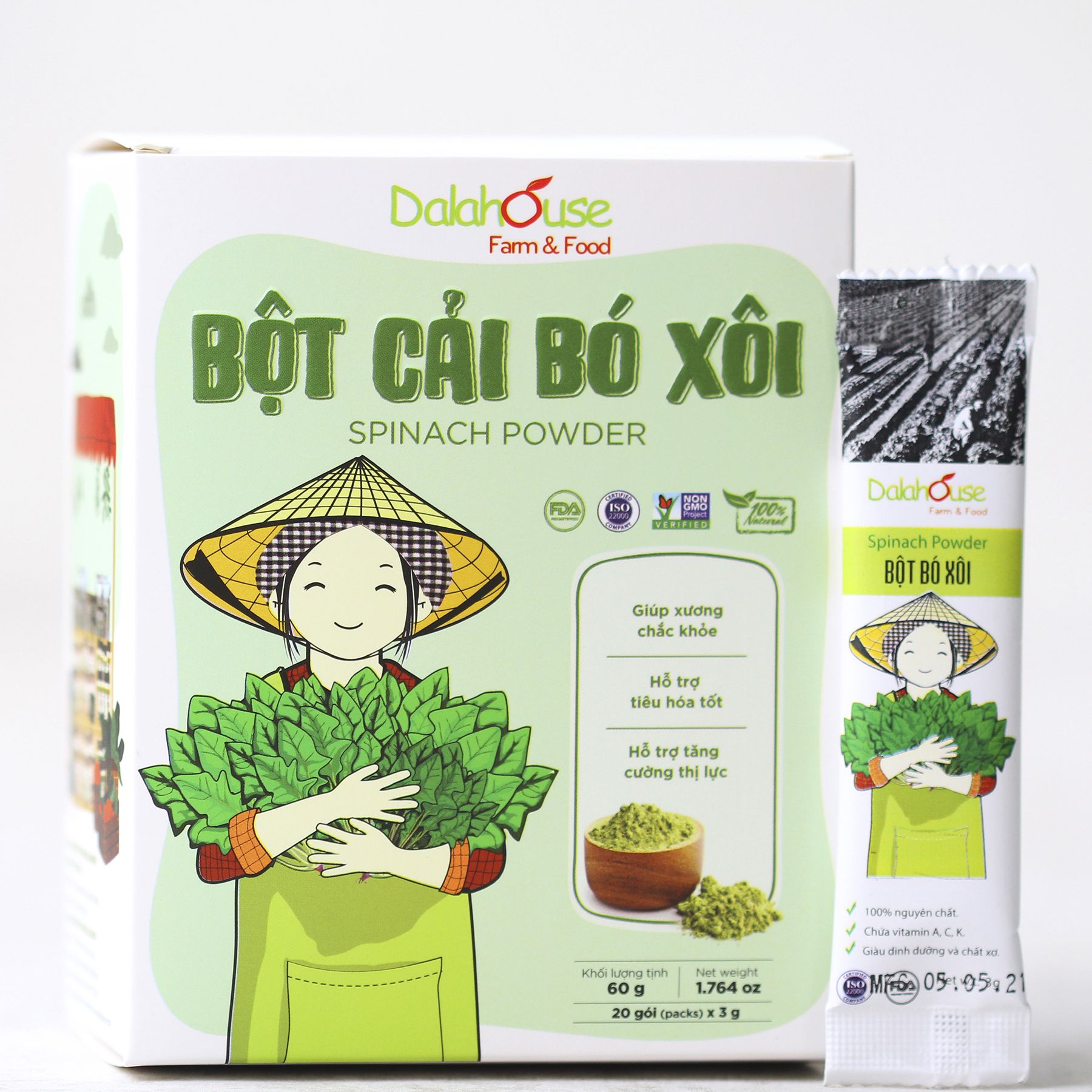 Quy cách: Bột Cải Bó xôi được đóng hộp 60g gồm 20 gói nhỏ 3g tiện dụng, dễ mang theo khi di chuyển nhiều; canh chỉnh chuẩn xác liều lượng mỗi lần sử dụng.