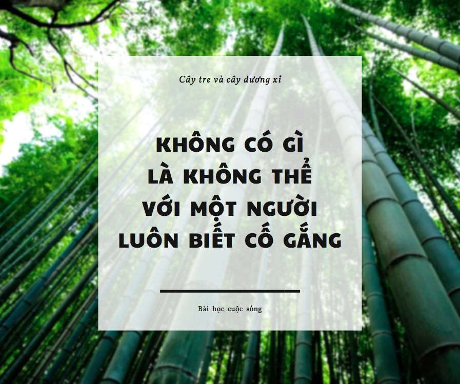 … Rồi vào năm thứ năm, một mầm xanh tí hon vươn mình lên khỏi mặt đất. So với đám dương xỉ xung quanh, nó dường như quá nhỏ bé và chẳng chút quan trọng. Nhưng nó lớn lên từng ngày. Ban đầu là một cái mầm, rồi là cây nhỏ, và sau cùng là một cây sậy. Chỉ 6 tháng thôi, cây tre đã cao hơn 30 mét. Nó đã mất tới 5 năm để phát triển bộ rễ. Những cái rễ của nó rất mạnh mẽ và có thể cung cấp cho nó mọi thứ cần thiết để sinh tồn.Ta đã không cho cây tre một chút thử thách nào mà nó không kham được”.