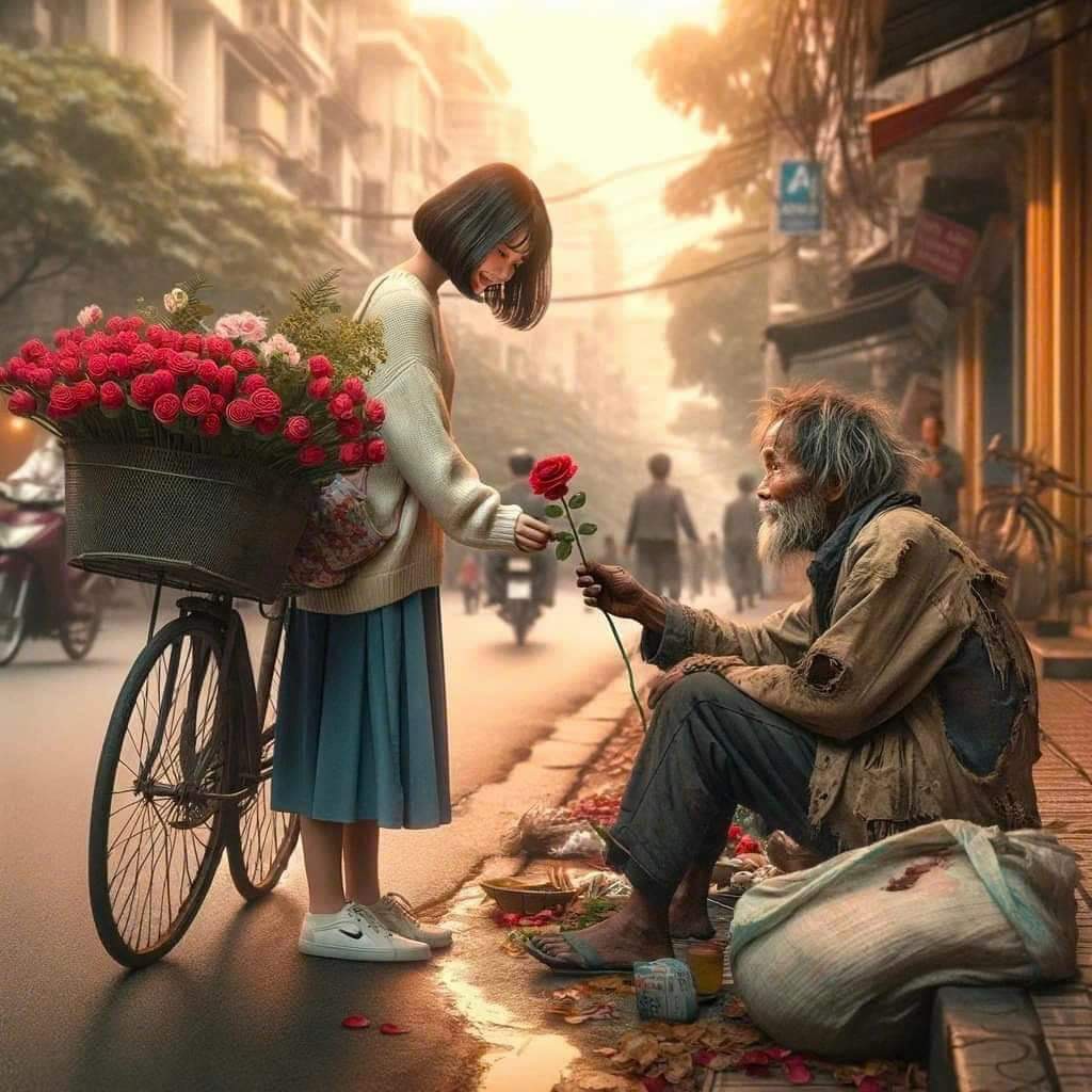 Người ăn xin chưa từng nhận được sự quan tâm và hành động tử tế như vậy. Một bông hoa hồng từ một cô gái đã thay đổi suy nghĩ của ông ta. Ông quyết định không ăn xin nữa và trở về nhà.