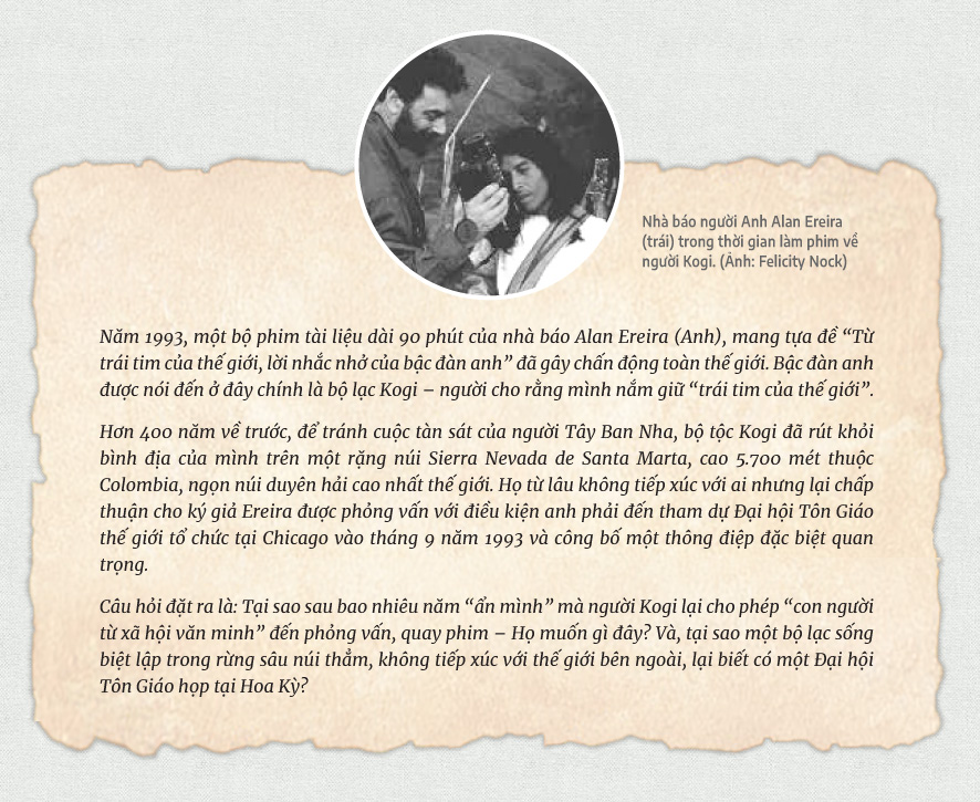 Gần ba mươi năm trước, vào tháng 2 năm 1993, phái đoàn ký giả đài BBC rời rặng Sierra trở về lại với thế giới chúng ta mang theo bức thông điệp của người Kogi - những người Anh trong gia đình nhân loại. Bức thông điệp khuyến cáo nhân loại đang trong tình trạng nguy kịch vì hậu quả của việc phá hoại môi sinh đến hồi báo động. Bức thông điệp đã gây chấn động dư luận thế giới lúc bấy giờ.