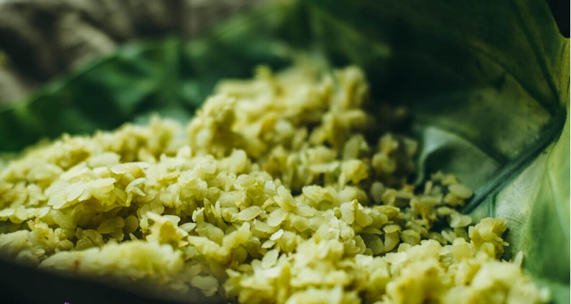 - Lót lá sen hoặc lá nếp, bày cốm ra đĩa, rắc dừa lên và thưởng thức.