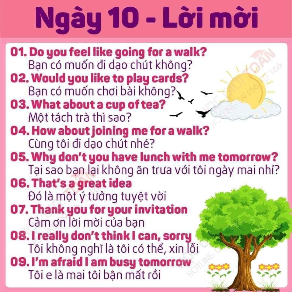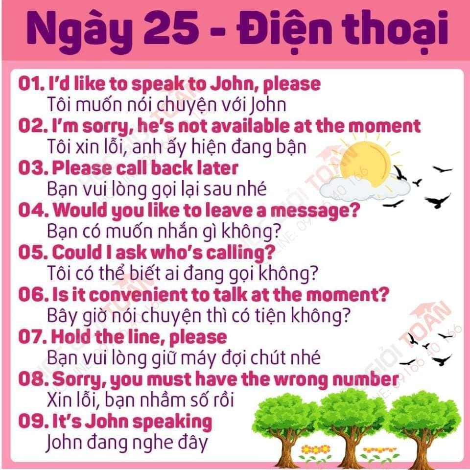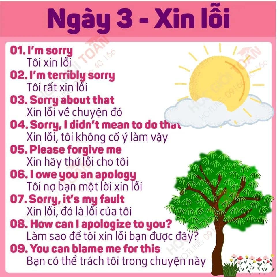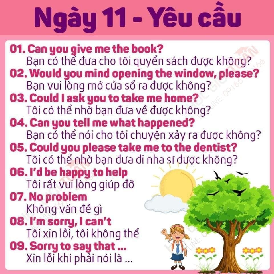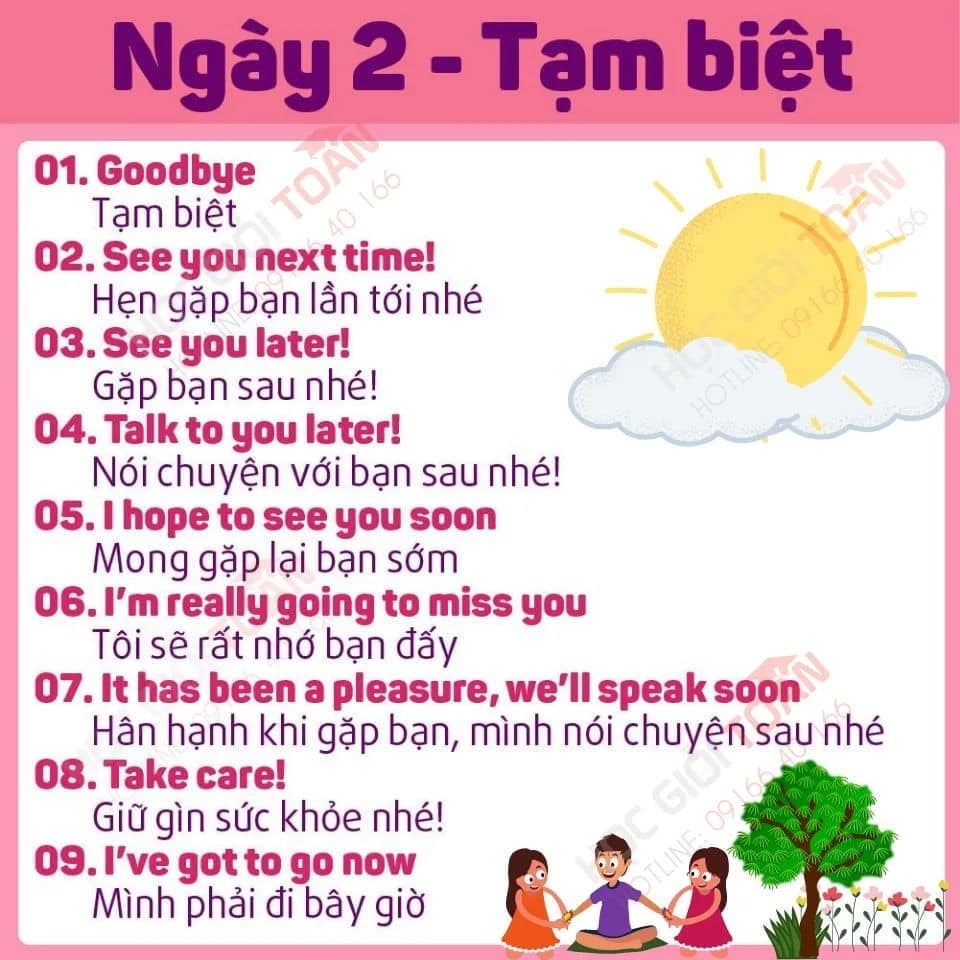 Tiếng Anh là công cụ giao tiếp chung trên toàn thế giới. Nên học tiếng Anh tốt sẽ là hành trang cho con trẻ tự tin trở thành công dân toàn cầu. Trong quá trình đó không thể thiếu sự đồng hành của bố mẹ. Sau đây là các mẫu câu trong 30 ngày giao tiếp tiếng Anh cùng con, đó không phải là tất cả nhưng là những mẫu câu rất cơ bản và thường dùng trong cuộc sống. Bố mẹ nên tham khảo và chịu khó 'chat' với con hàng ngày để giúp con trau dồi, phát triển "vốn" sinh ngữ quốc tế phổ thông nhất này nhé.