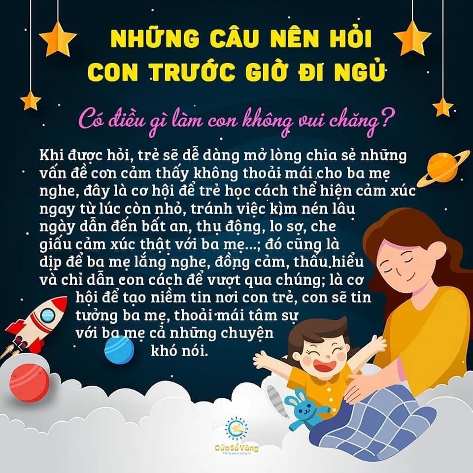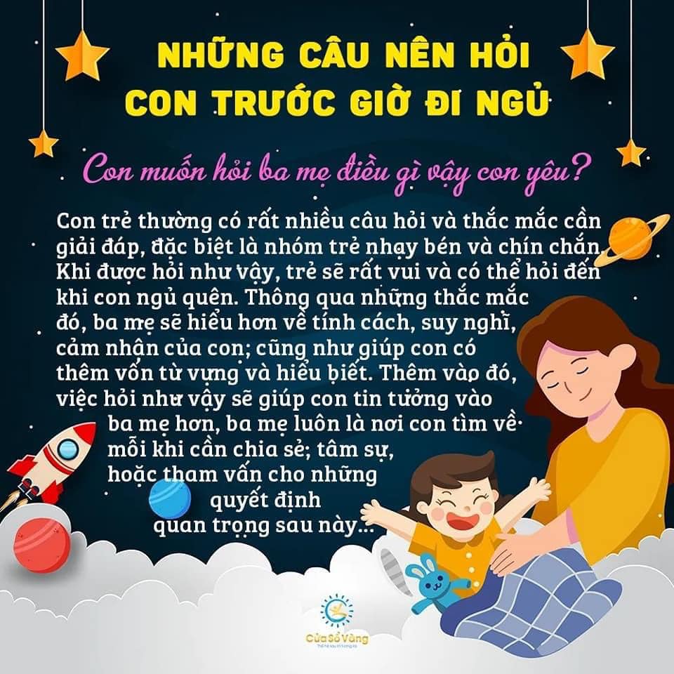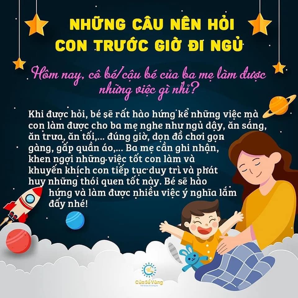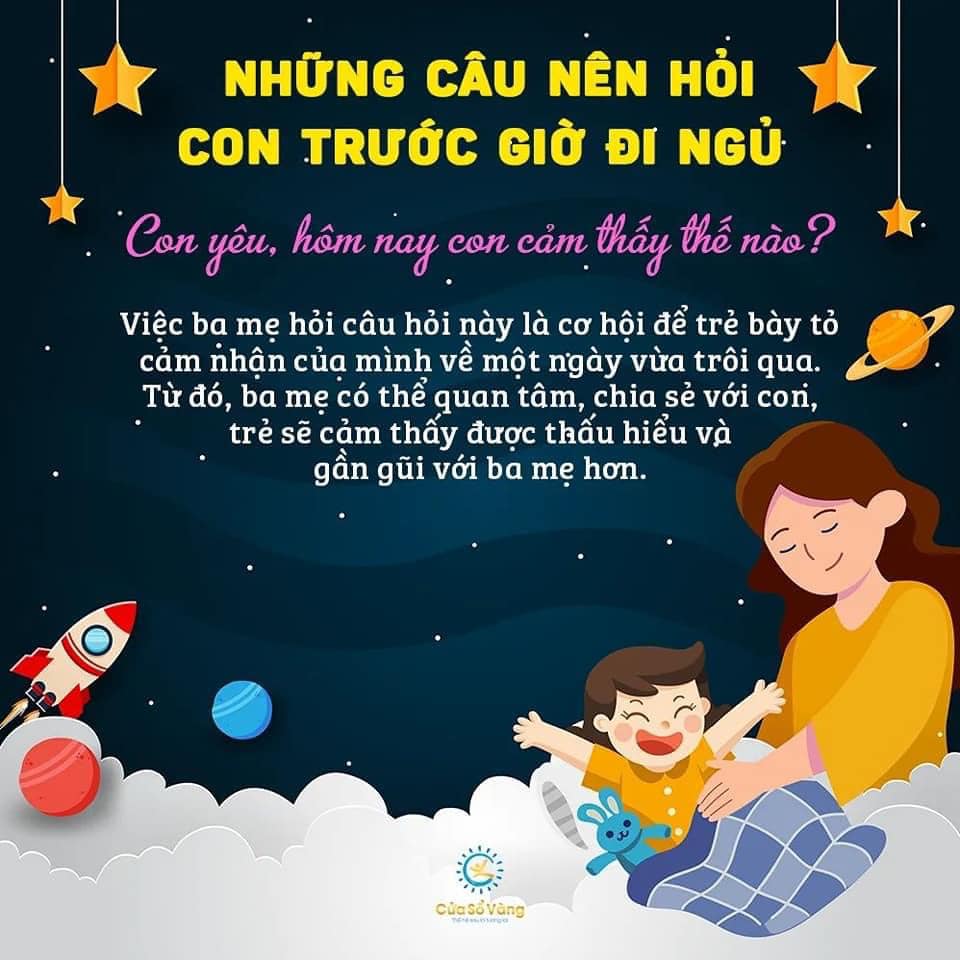 Ba mẹ nên dành thời gian trò chuyện và hỏi han con thường xuyên hàng ngày đặc biệt là vào thời điểm trước khi đi ngủ sẽ giúp ba mẹ gần gũi con, hiểu con hơn, con cảm thấy được quan tâm, yêu thương và phát triển tư duy cảm xúc. Ba mẹ tham khảo 8 câu hỏi sau nhé.