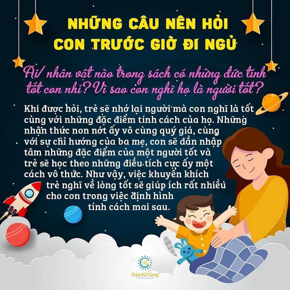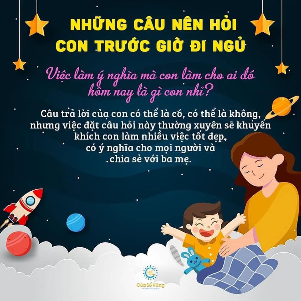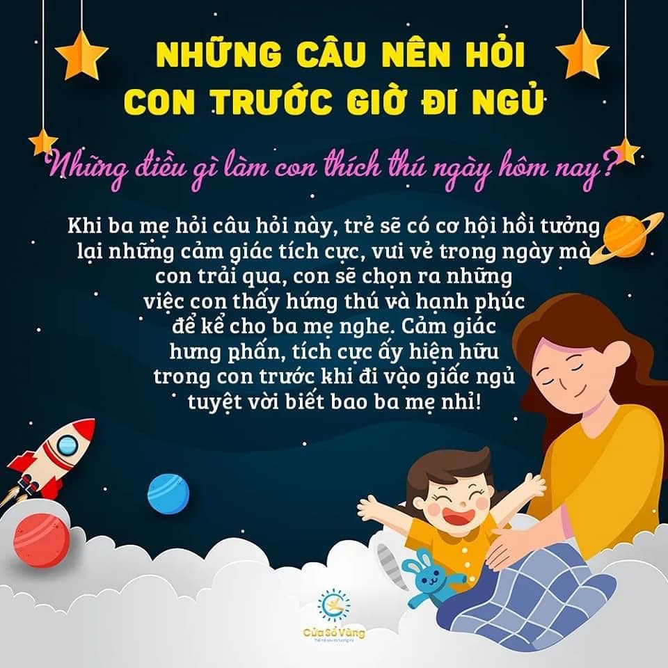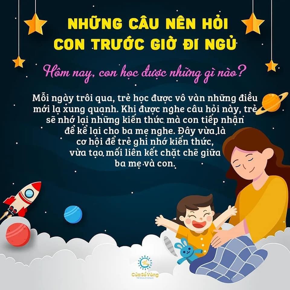 Ba mẹ nên dành thời gian trò chuyện và hỏi han con thường xuyên hàng ngày đặc biệt là vào thời điểm trước khi đi ngủ sẽ giúp ba mẹ gần gũi con, hiểu con hơn, con cảm thấy được quan tâm, yêu thương và phát triển tư duy cảm xúc. Ba mẹ tham khảo 8 câu hỏi sau nhé.