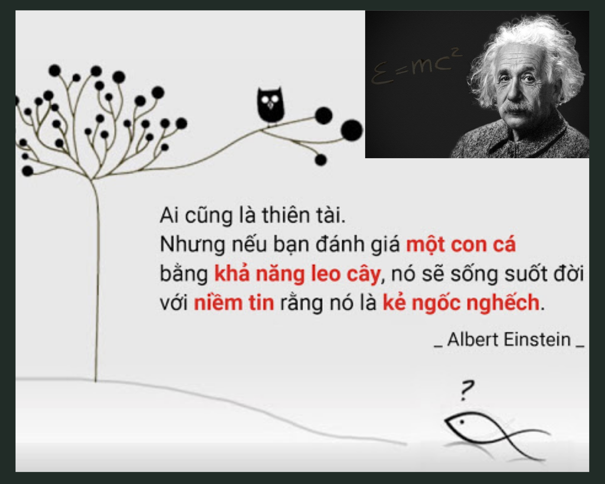 Nhà bác học Anhxtanh cũng từng nói: "Ai cũng là thiên tài, nhưng nếu bạn đánh giá con cá bằng khả năng leo cây, nó sẽ sống suốt đời với niềm tin rằng nó là kẻ đần độn".