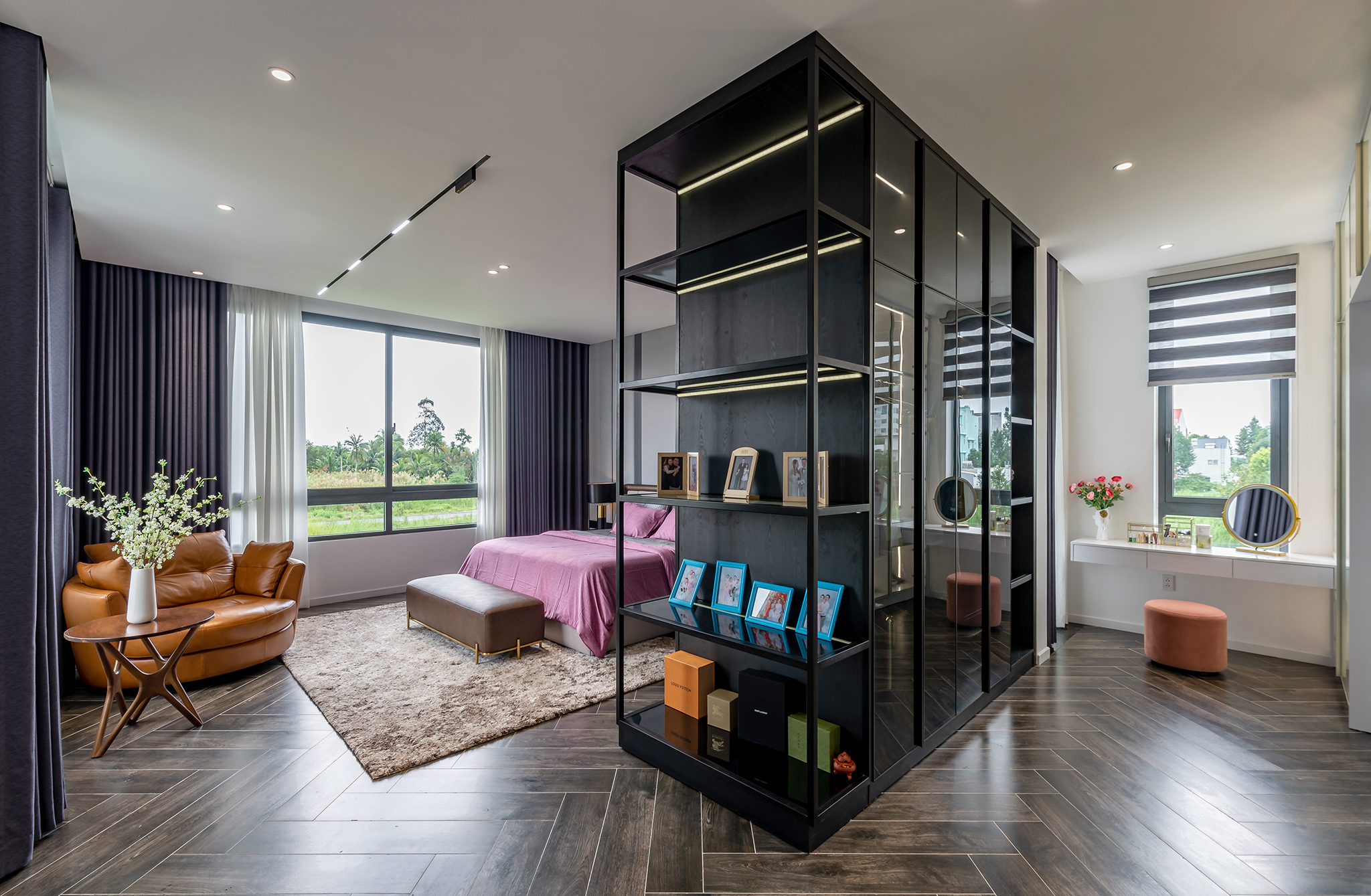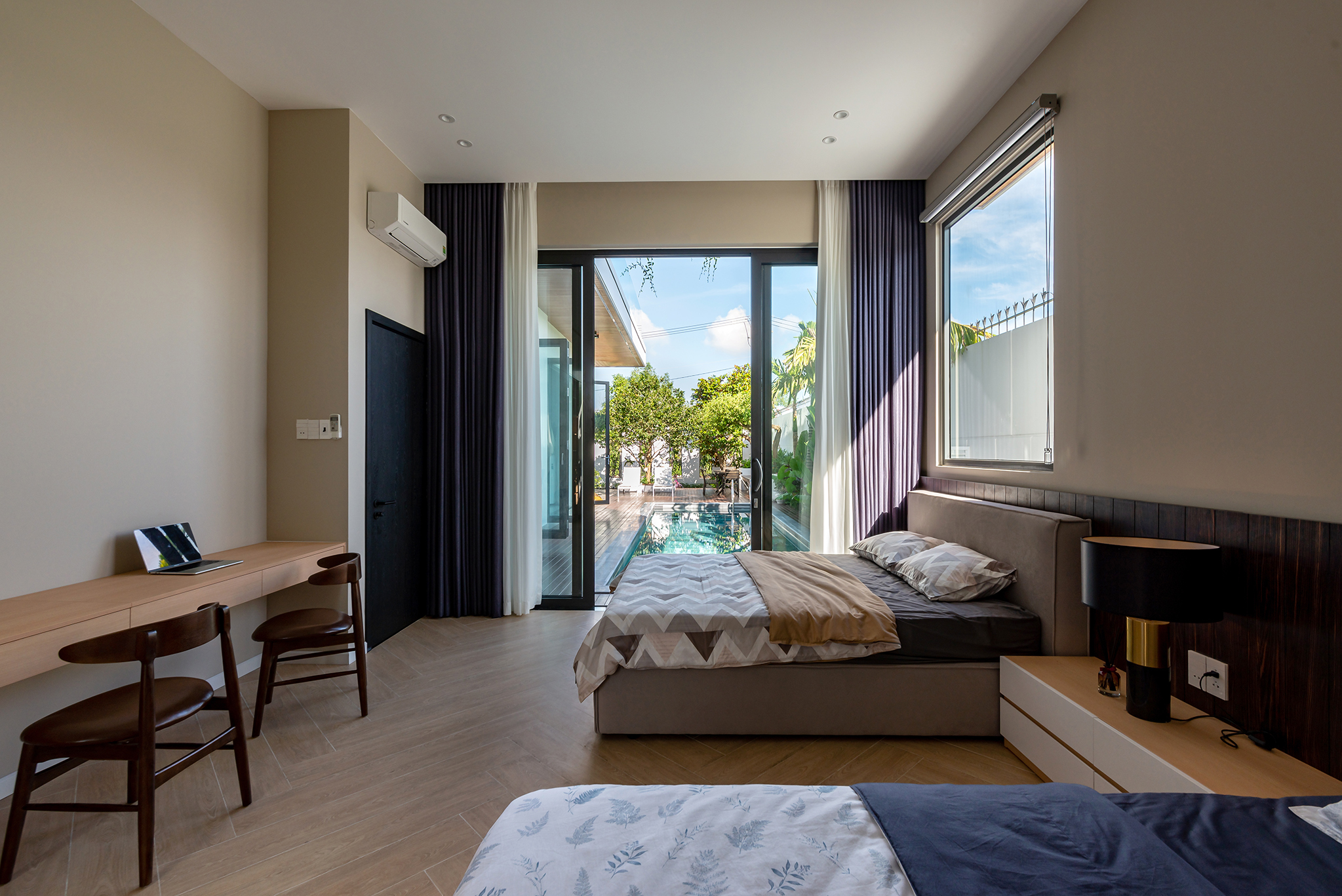 Phòng ngủ ông bà được bố trí ở tầng một để thuận tiện cho việc chăm sóc và di chuyển ra không gian bếp - ăn. Các phòng chức năng đều có cửa hướng ra khu vực hồ bơi và vườn cây.'