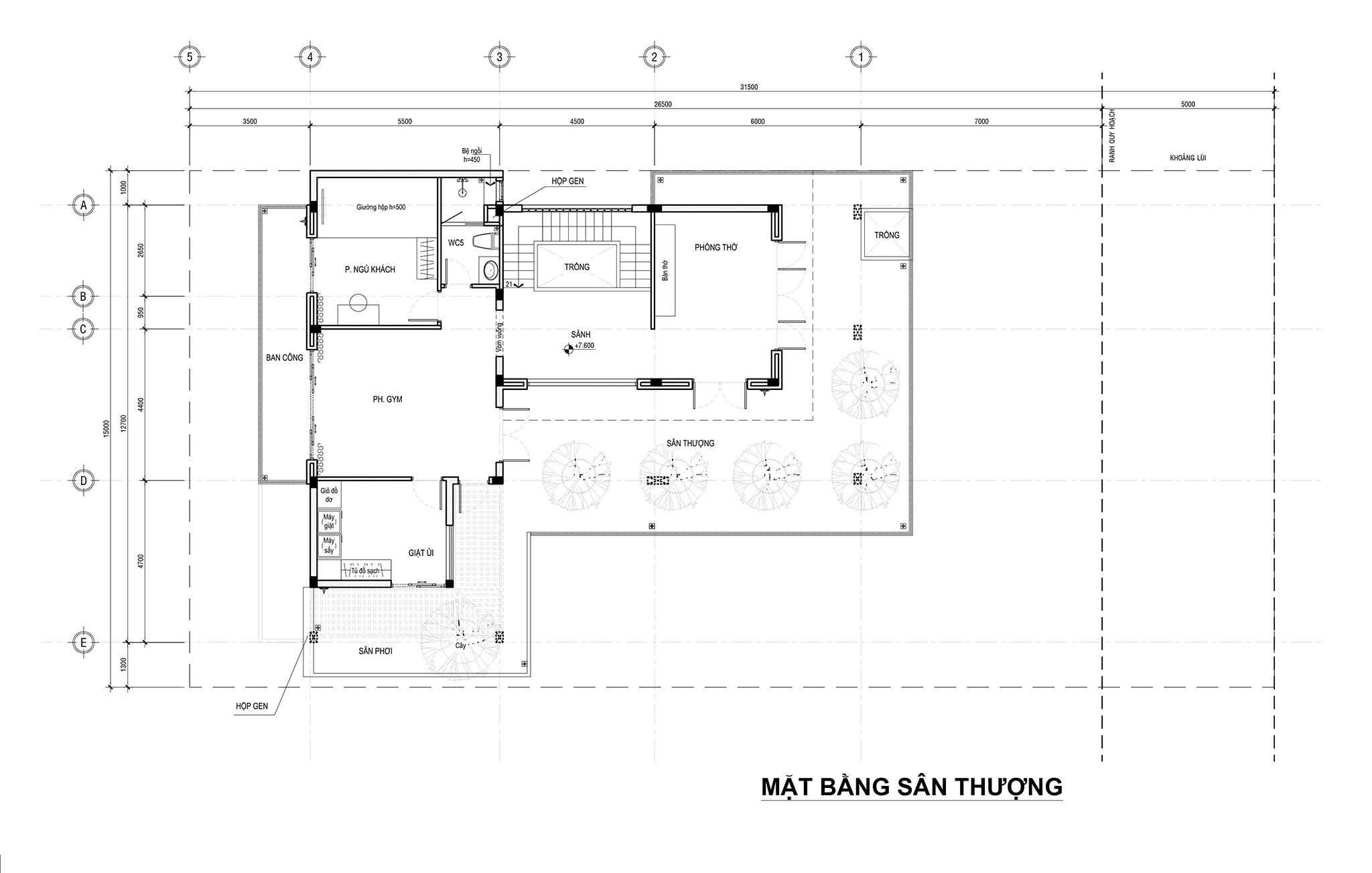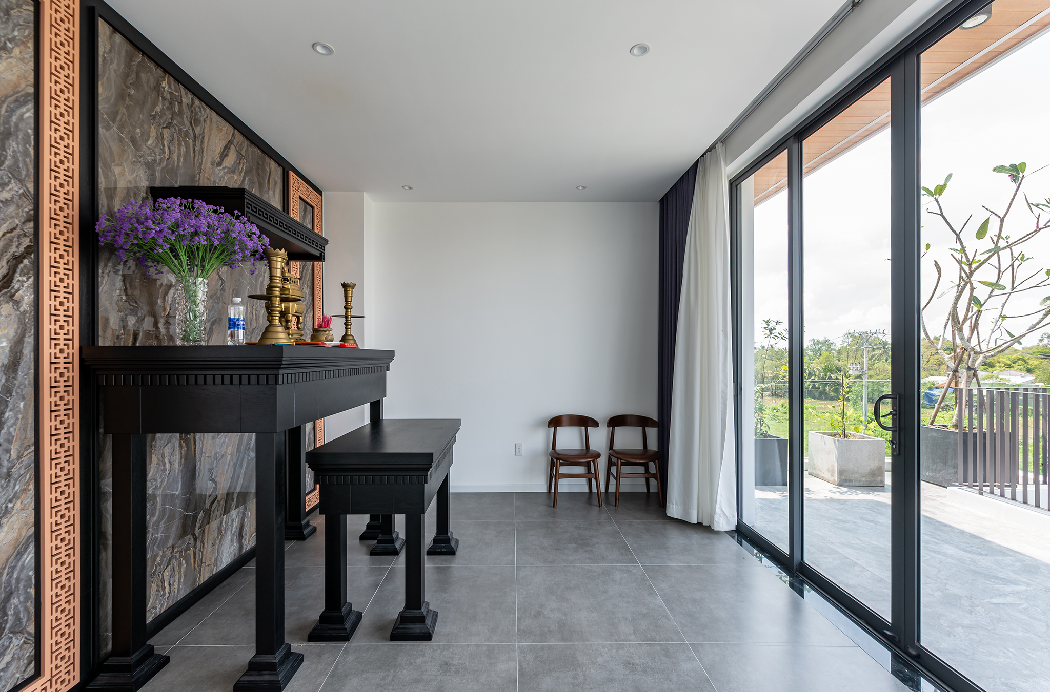 Tầng thượng gồm một phòng ngủ cho khách, phòng thờ, khu giặt phơi và khoảng sân rộng để trồng cây.