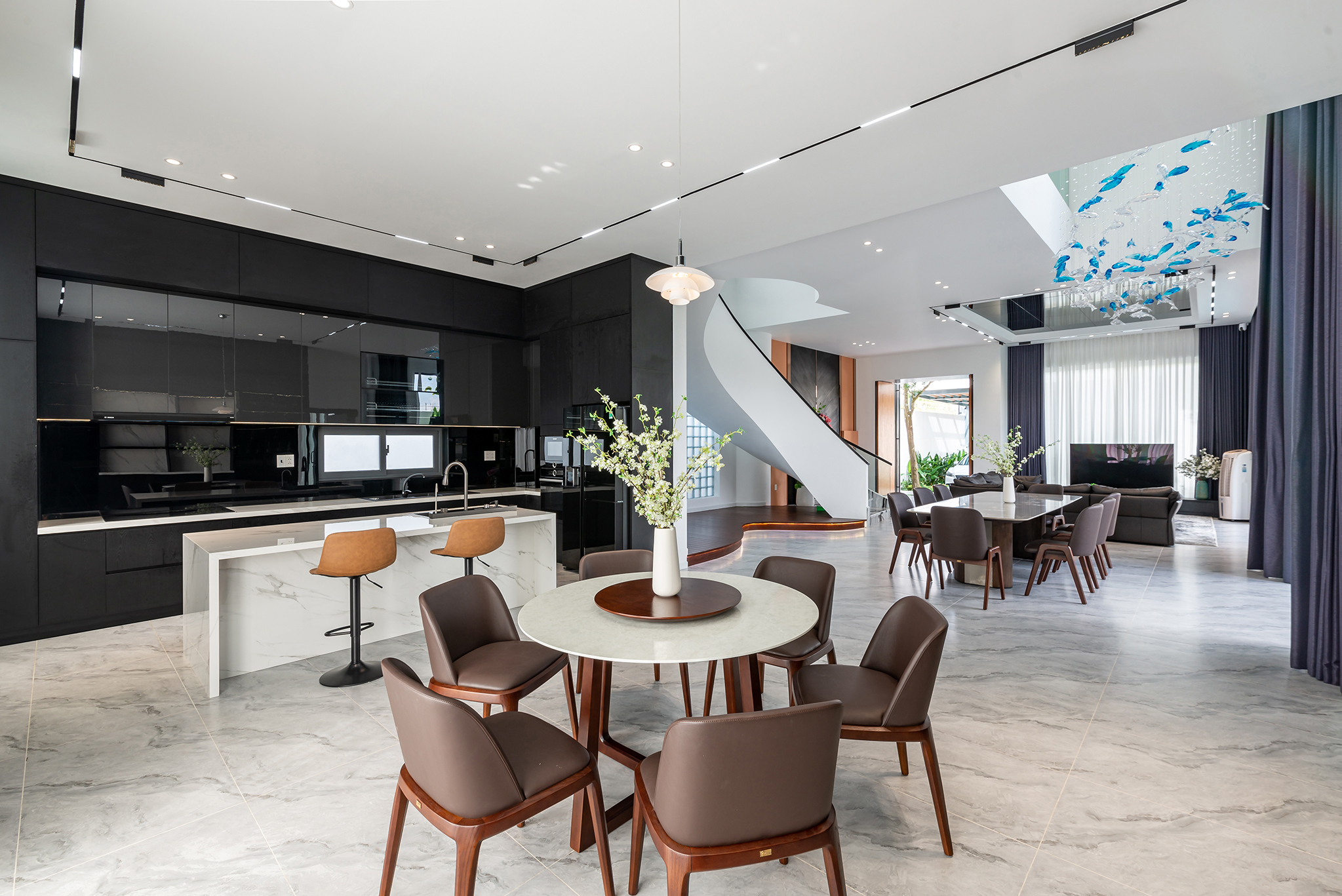 Dựa theo thói quen sinh hoạt của gia chủ, phòng bếp - ăn được ưu tiên bố trí khoảng không rộng rãi. Kết hợp với 2 bàn ăn lớn, quầy bar giúp gia chủ dễ dàng đón tiếp đông người cùng lúc khi có tiệc hay gặp gỡ họ hàng, bạn bè dịp cuối tuần.