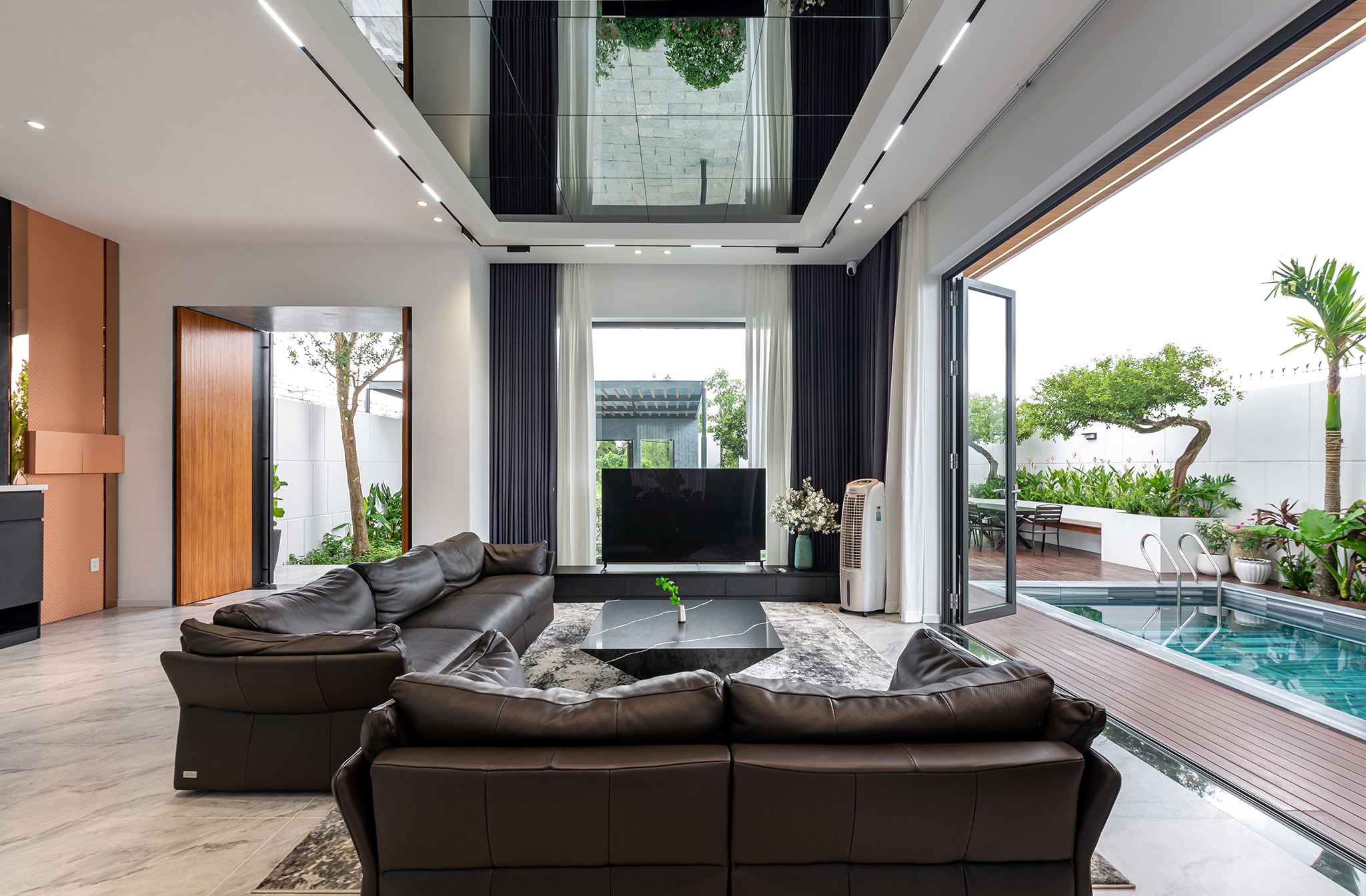 Phía trước căn biệt thự là rạch Cái Nai nối với sông Cần Thơ. Chính vì vậy, kiến trúc sư sử dụng hệ cửa kính lớn bao bọc ở 3 hướng, nhằm khai thác tầm nhìn rộng mở ra ngã ba sông, đồng thời lấy gió vào từng không gian.
