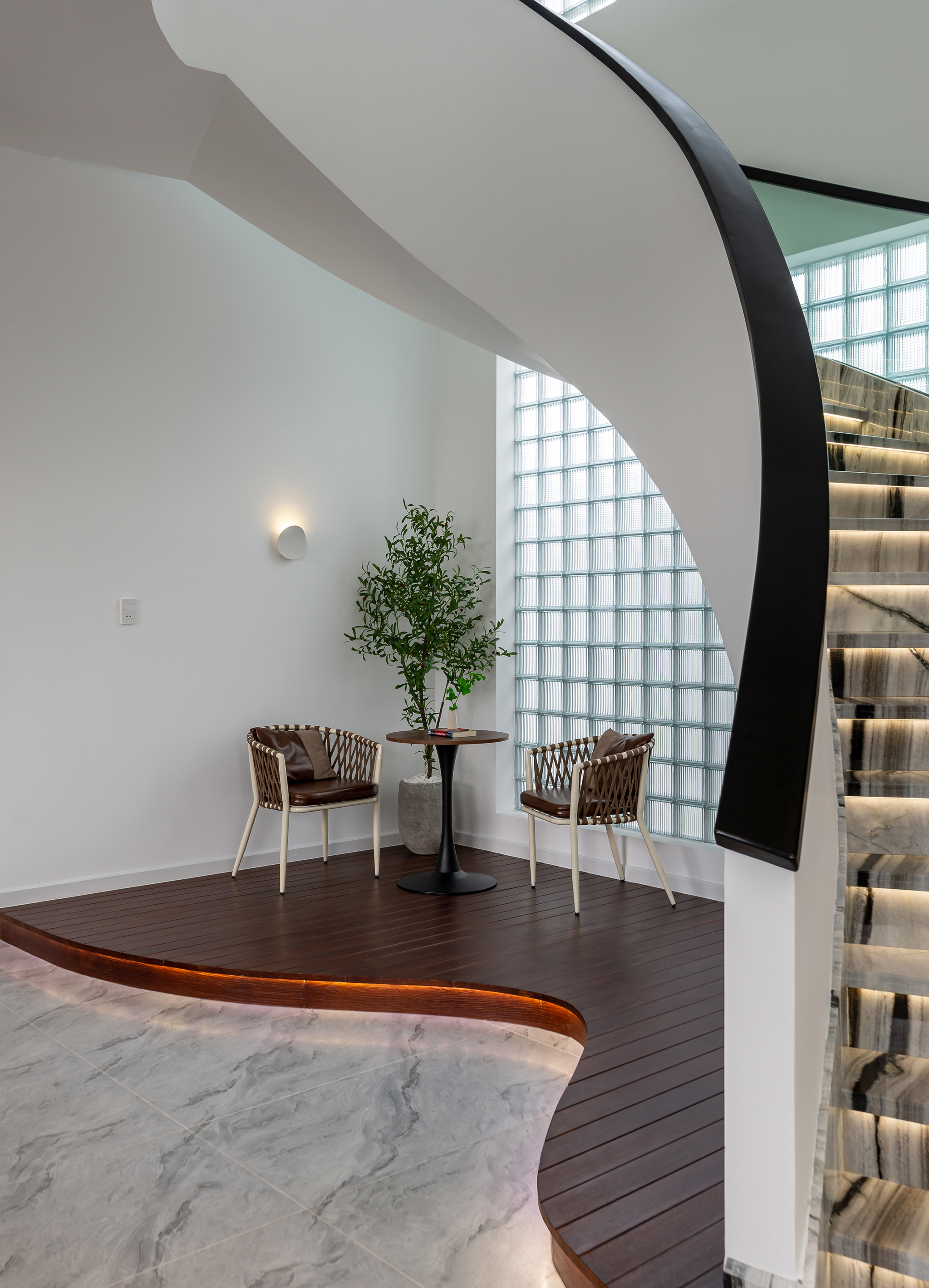 Trục liên thông giữa các tầng đều tràn ngập ánh sáng nhờ sử dụng gạch kính, tạo nên điểm nhấn cho tường và khu vực cầu thang.