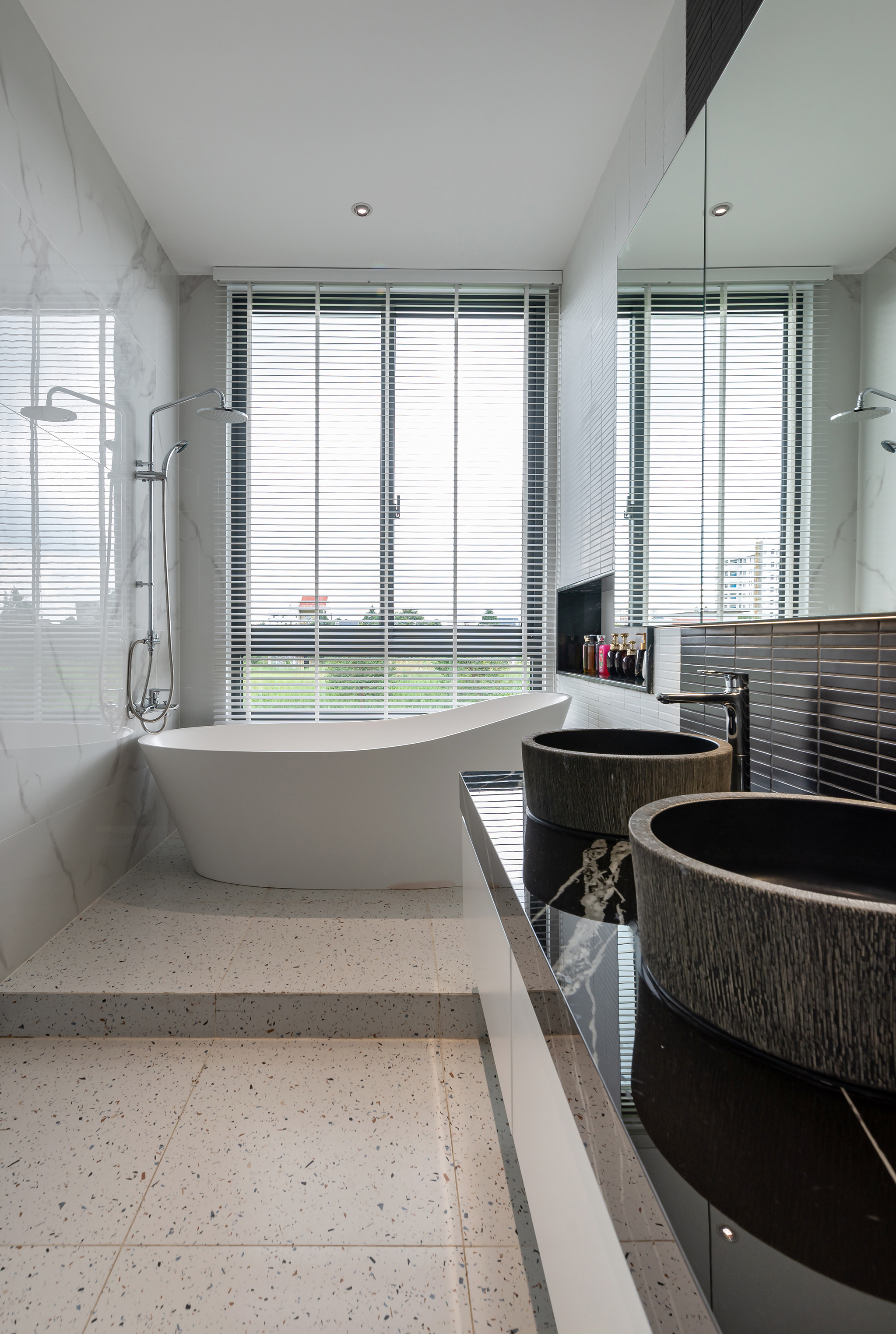 Phòng vệ sinh có thiết kế bồn tắm nằm để phục vụ nhu cầu thư giãn.