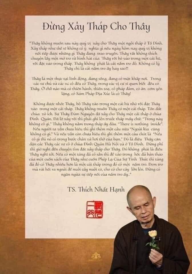 Xin kính cẩn nghiêng mình cảm tạ công ơn của Người vì hoà bình, hạnh phúc của muôn chúng sinh và xin lễ biệt Người. Giờ đây chắc hẳn Người đã được về bên Đức Phật và Bồ Tát. Thế gian từ đây vắng bước chân Người, nhưng pháp thân của Người còn sống mãi trong lòng những phật tử chân chính trên khắp hành tinh này. Nam Mô Bổn Sư Thích Ca Mâu Ni Phật 🙏🙏🙏